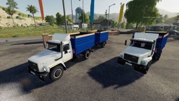 ГАЗ-35071 и САЗ-83173 в FS 2019 снабжены динамическими шлангами. Разгрузка осуществляется на 3 стороны. Подвеска реалистичная, анимации мостов нет, но под грузом проседает. Перевозит стандартные грузы, функционирует с силосным комбайном. Динамические брызговики только на прицепе. Звук переключения скоростей. Пачкаются только колеса. Есть функциональные зеркала, но мутноватые.