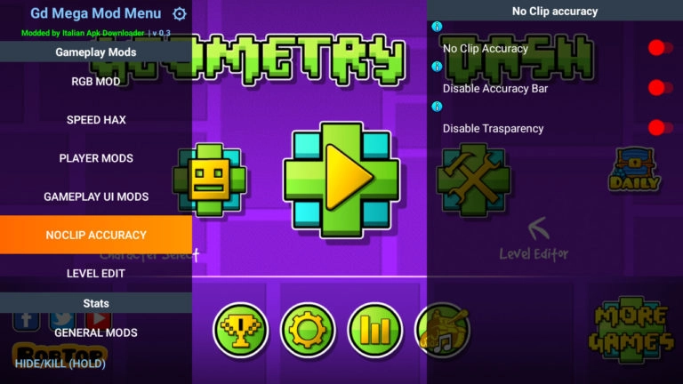 Geometry Dash многим может показаться крайне сложной игрой, но не все готовы тратить много времени и упорно тренировать прохождение уровней. Если вы один из таких казуальных геймеров, но хотите насладиться красивой ритмичной аркадой, то скачайте версию с нашего сайта. В установщик вшито дополнительное меню с большим количеством читом, один из которых noclip – позволяет стать призраком и пройти сквозь все препятствия. Вы не коснетесь ловушек и шипов, а значит, со 100-процентной вероятностью пройдете испытание с первой попытки!