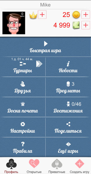 Перед началом игры пользователь заполняет имя профиля и по желанию может добавить фотографию. После этого можно сразу приступать к карточного развлечению. Игра имеет более десятка лиг и одну премиальную, где собираются настоящие профессионалы. В каждой лиге показаны доступные столы, куда вы можете присесть. Одновременно в Дурака могут «резаться» до 6 человек. Если в списке столов вы не найдёте подходящий для вас, то всегда можно создать свой. Для этого нужно перейти в раздел «Создать игру» и указать нужные настройки. В них вы можете определить количество игроков, ставку, скорость игры, число карт в колоде и выбрать режим. В «Дурак Онлайн» есть подкидной и переводной вариант. Здесь же можно поставить пароль, чтобы никто посторонний не мог сесть за стол. Геймеры могут добавлять в друзья понравившихся игроков. После модно будет их приглашать для приватный игры.