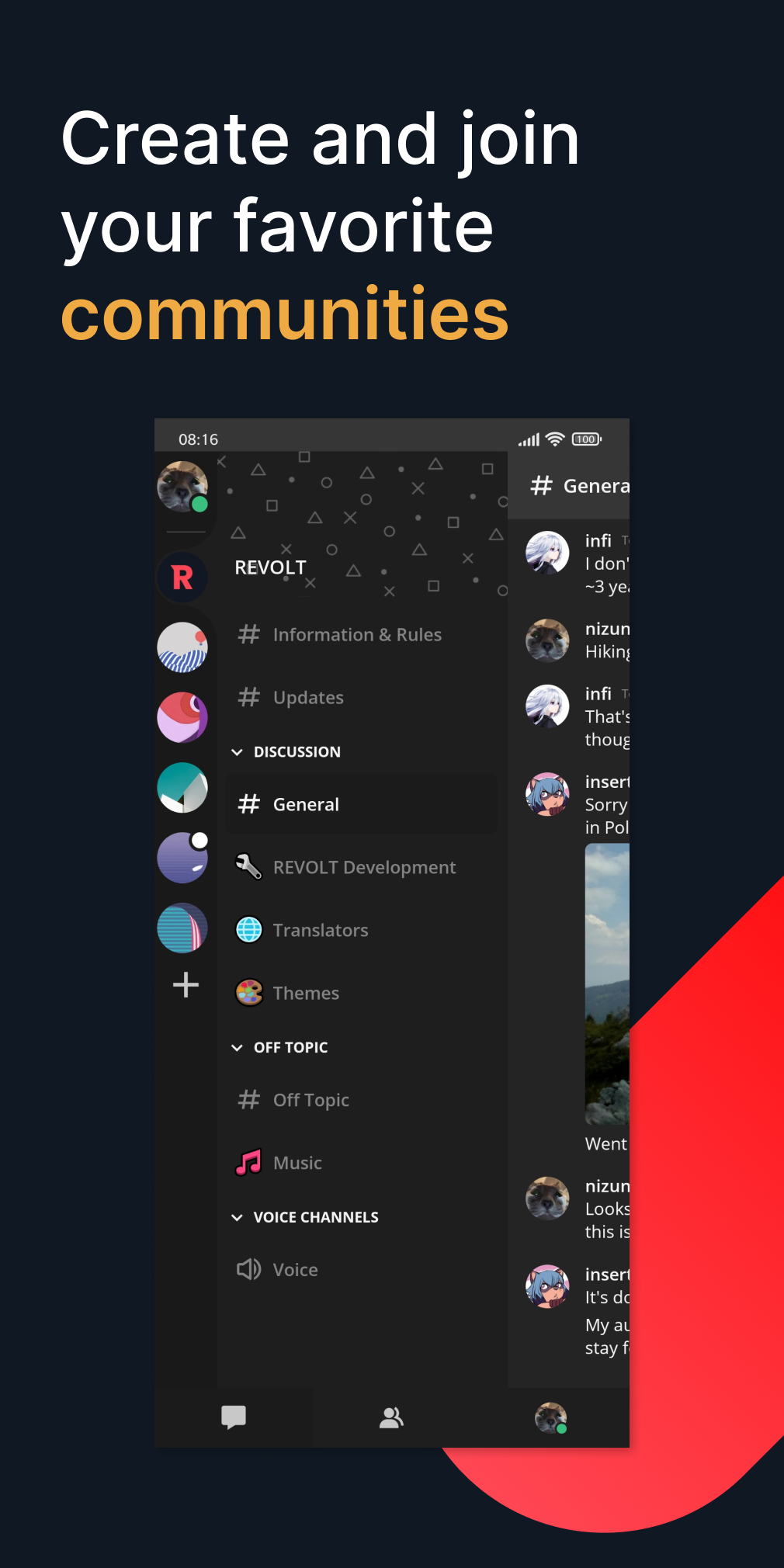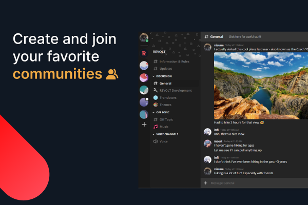 Revolt – удобный сервис для голосового общения. Подходит для любых целей и задач – конференции, онлайн-игры, трансляции экрана, обмен файлами и даже обычная переписка. На серверах можно хранить любую полезную информацию и всегда получать уведомления о занятости друзей. Чтобы скачать мобильную Revolt, воспользуйтесь ссылкой после краткого обзора.