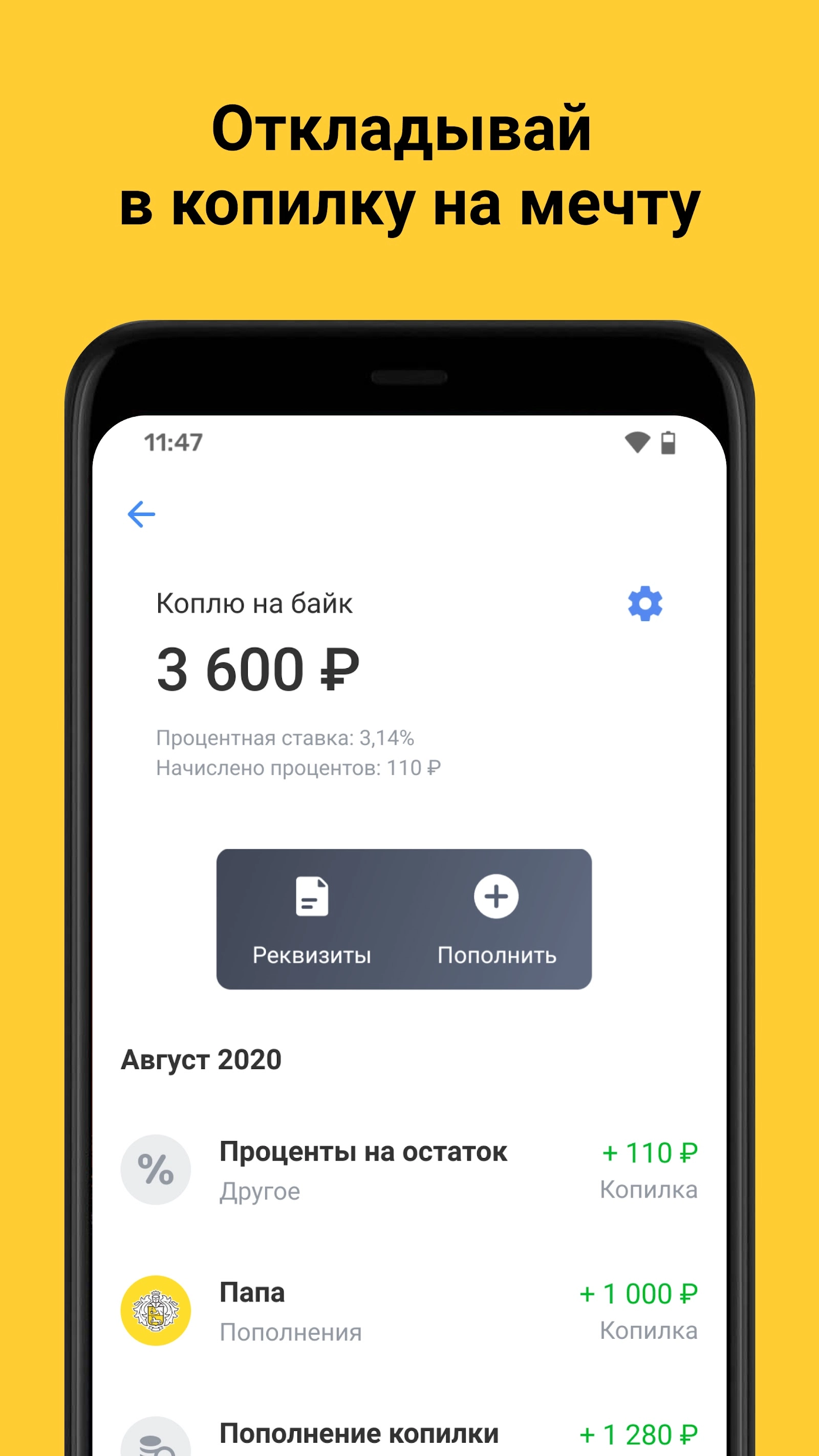 С помощью специального счета-копилки можно создавать цель и успешно откладывать на нее. Каждый месяц на этот счет будет капать определенный процент от остаточной суммы на балансе карточки, что упрощает процесс денежных накоплений.