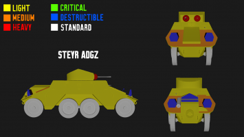 - Steyr ADGZ -> водитель (20 мм AP + mg34), наводчик переднего корпуса (mg34), наводчик заднего корпуса (mg34)